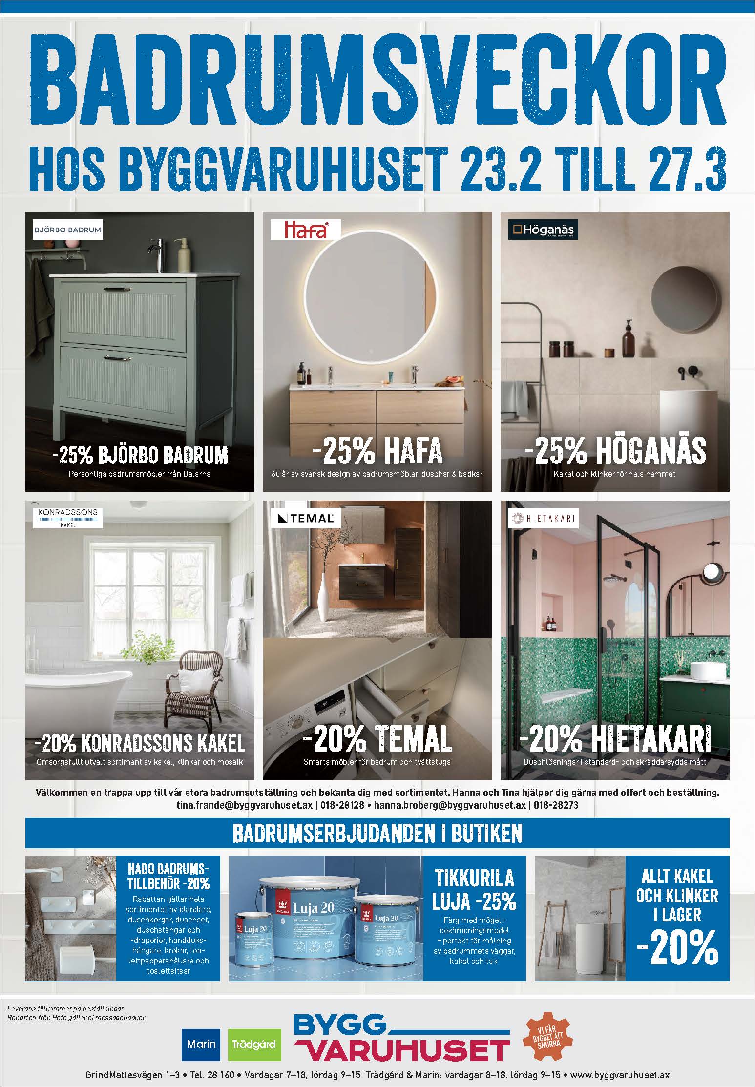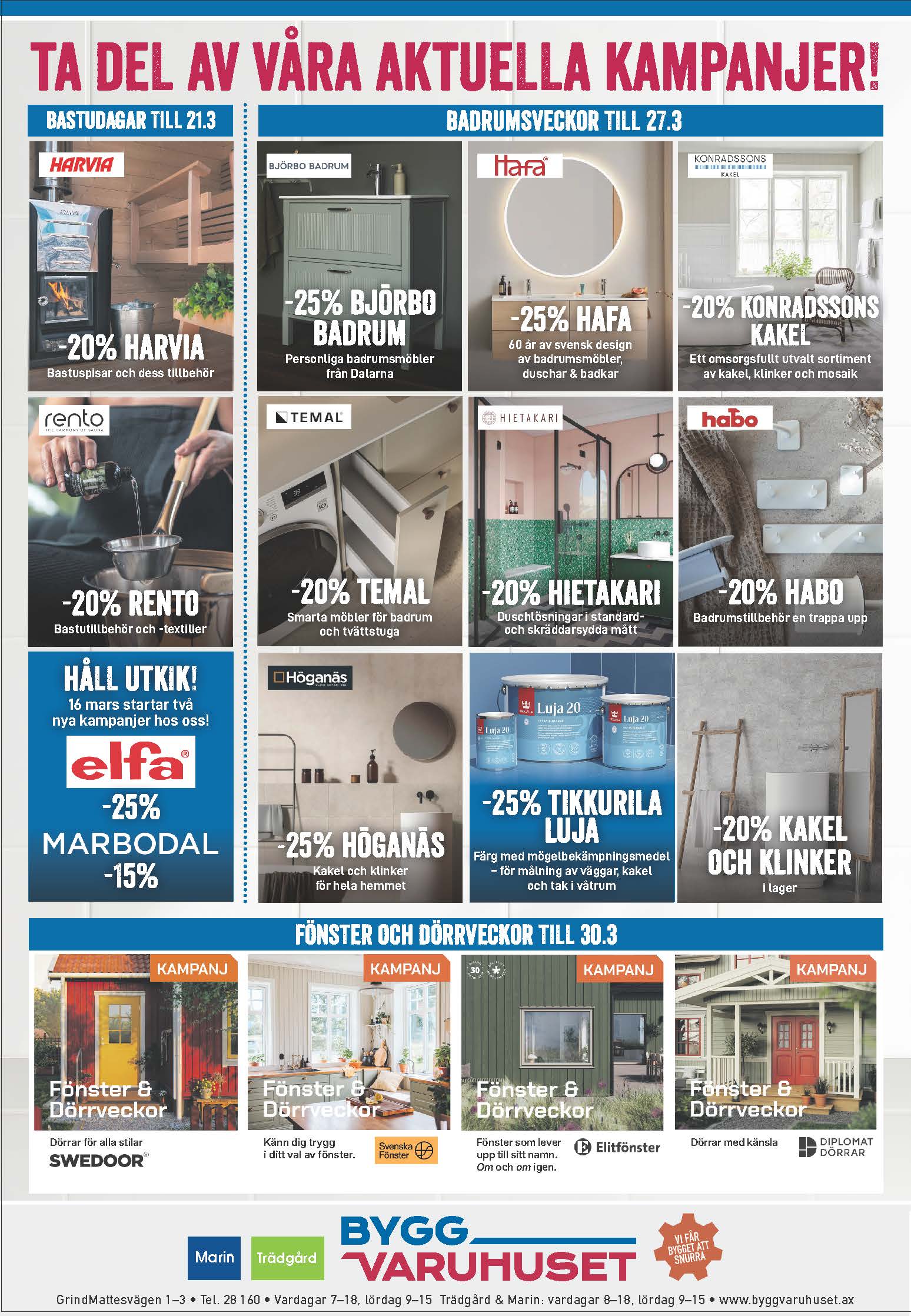 Nu pågår Bastudagar, Badrumsveckor och Fönster- och Dörrveckor för fullt, och från 16 mars kan du köpa Elfa till -25 % och Marbodal startar sin vårkampanj. Välkommen in!