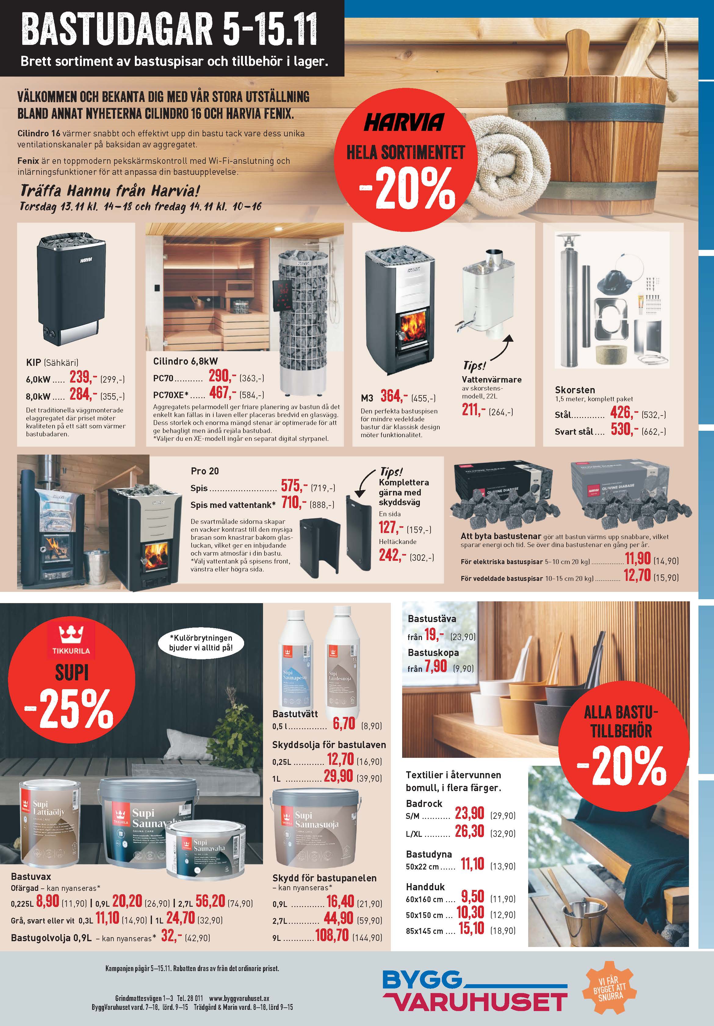 Du får -20 % på allt från Harvia (både från butik och beställningar), -20 % på alla bastuartiklar såsom dofter, textilier och bastustävar med mera och -25 % på Tikkurila Supi.