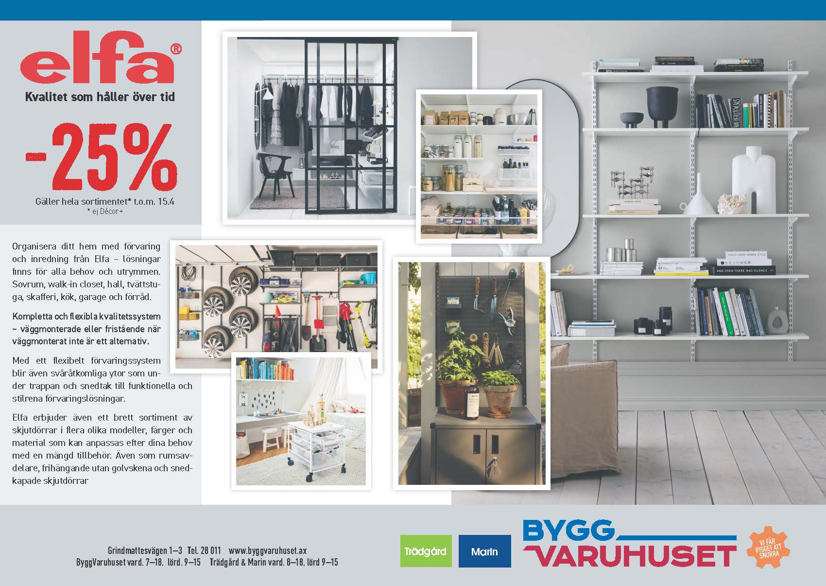 Till 15.4 får du -25 % på hela sortimentet av förvaring, inredning och skjutdörrar från Elfa!