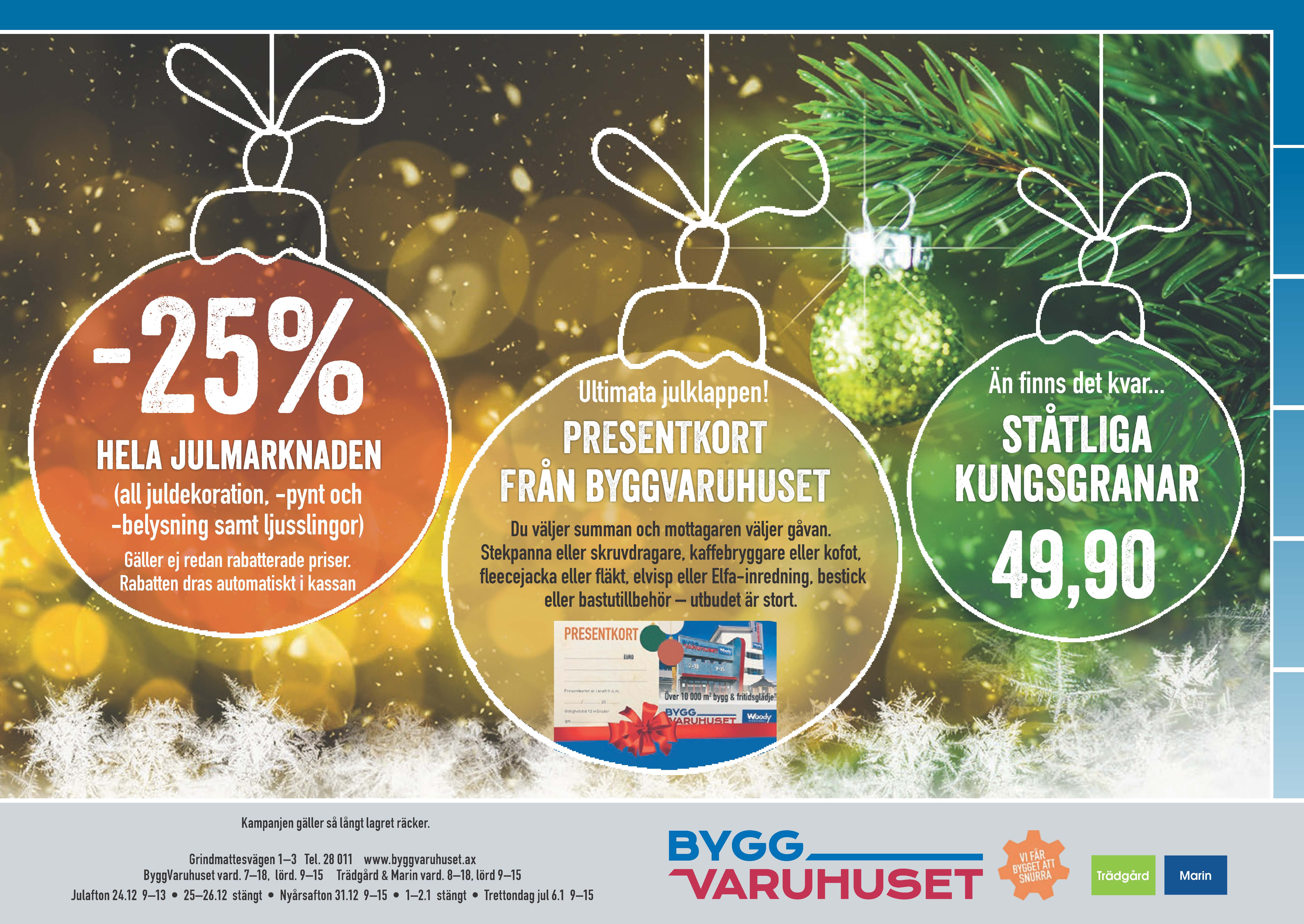 Du får -25 % på alla artiklar i vår stora julmarknad. Tips på julklapp är Byggvaruhusets presentkort – den ultimata gåvan! Du hittar ståtliga julgranar hos Trädgård & Marin!