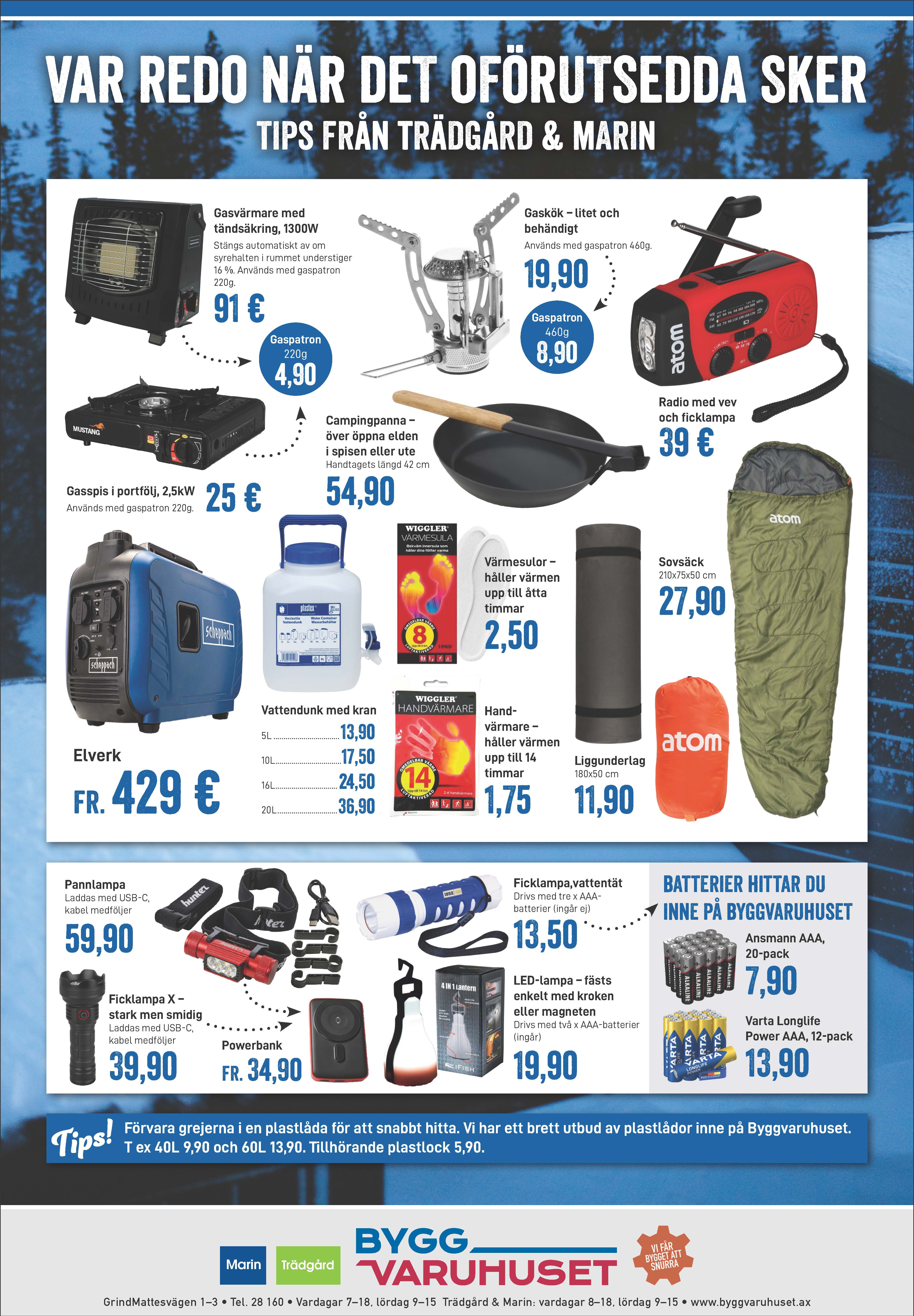 Hos Trädgård & Marin hittar du värmare, aggregat, belysning och mycket mer som underlättar vid till exempel strömavbrott.