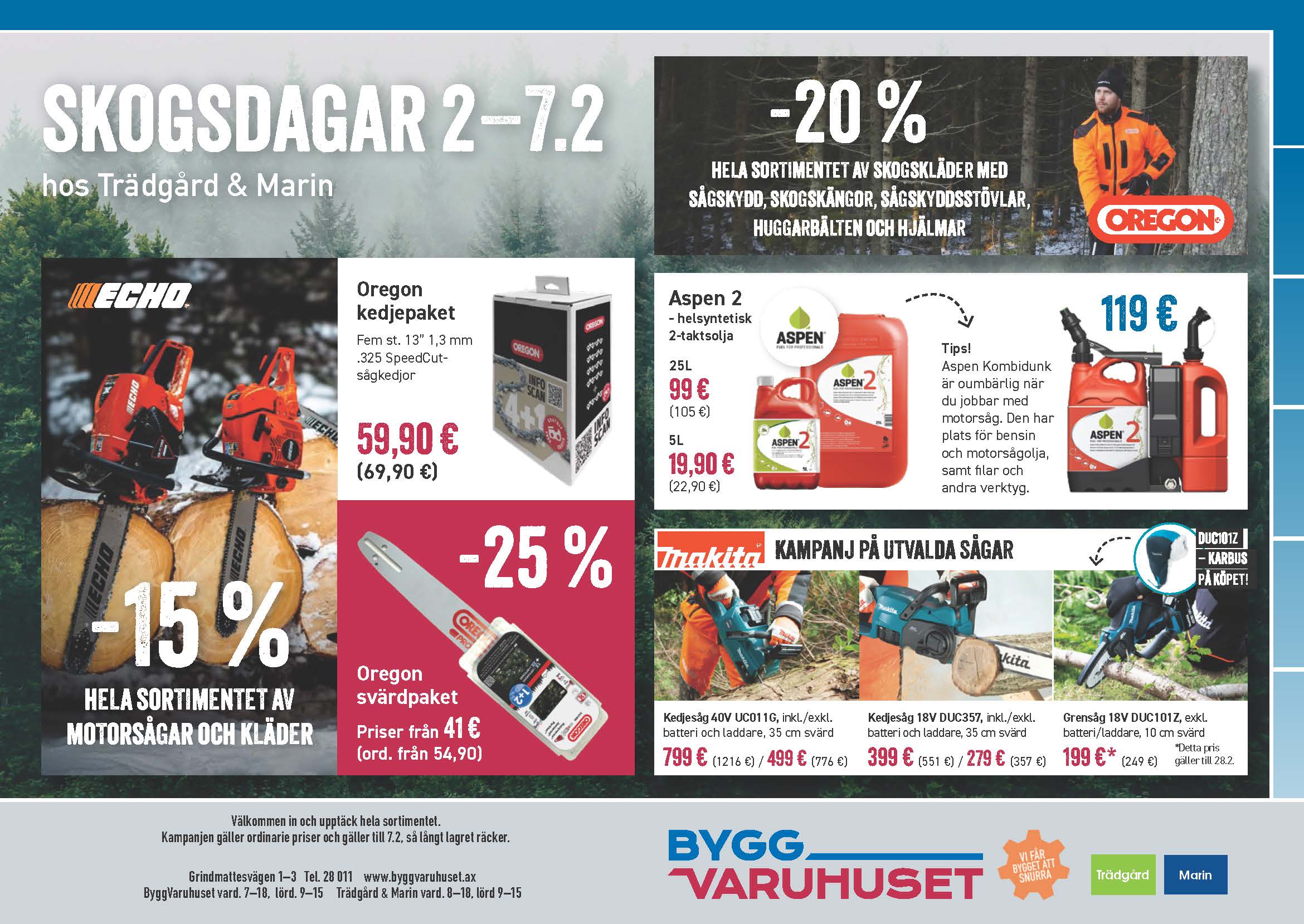 Skogsdagar med rabatt på sånt du behöver för en dag i skogen. Rabatt på skyddskläder och -skor, hjälmar, motorsågar och tillbehör. Kampanjen pågår 2–7.2