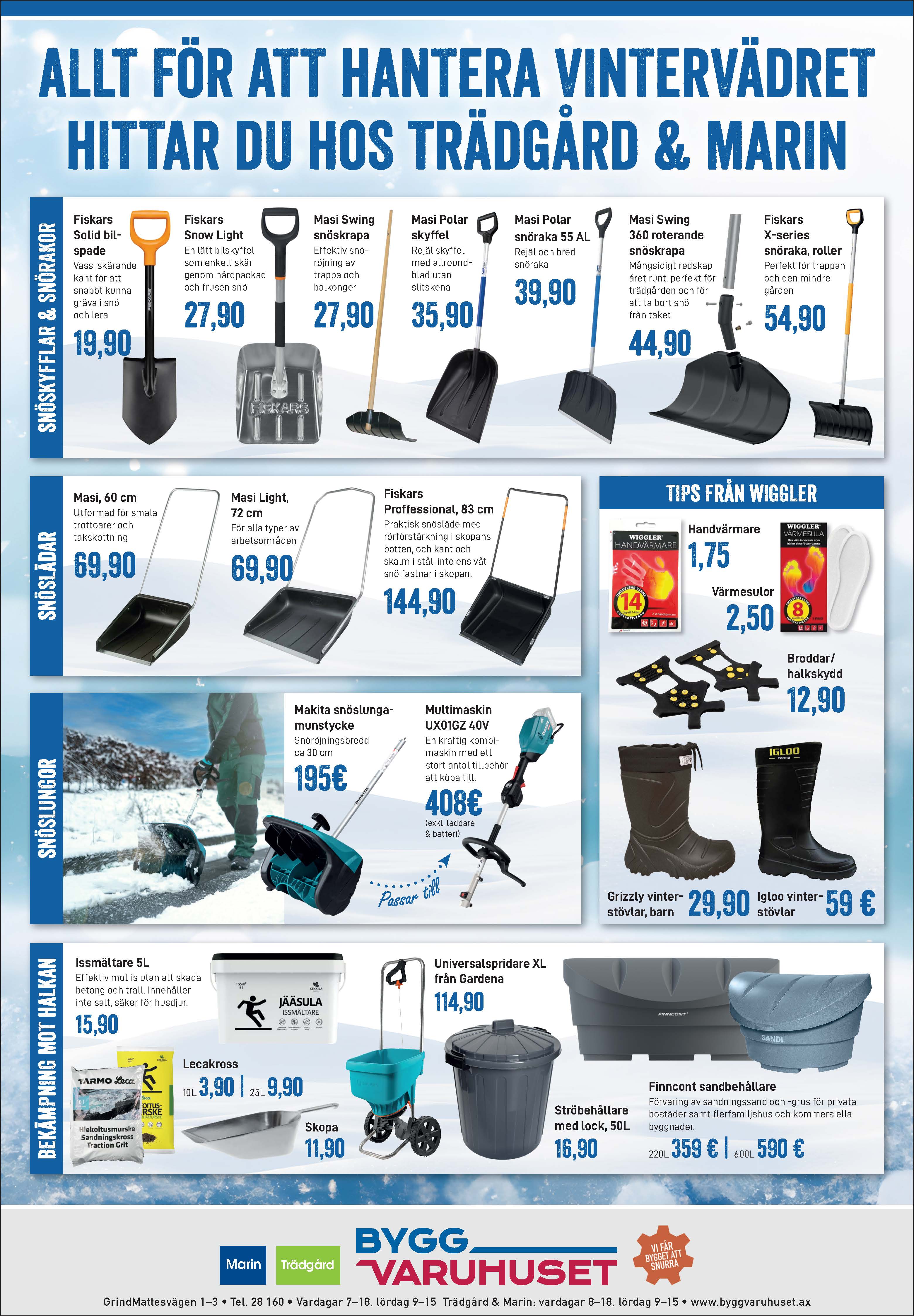 Hos Trädgård & Marin hittar du allt du behöver för att hantera vintervädret. Vi erbjuder snöskyfflar och -spadar från Fiskars och Masi. Vi kan även beställa hem snöslunga åt dig. Välkommen in!